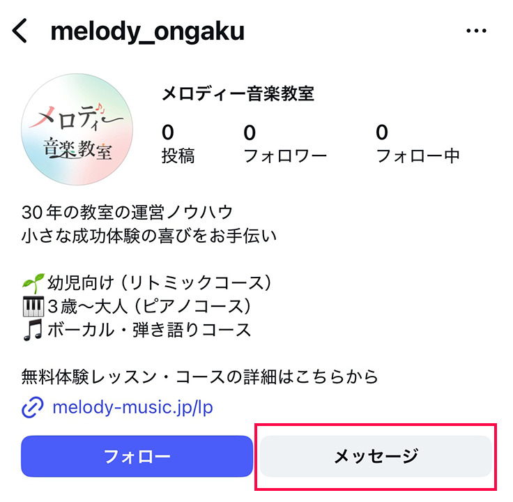 インスタのプロフィール(トップページ)にある赤線の「メッセージ」ボタンからお送りください。下の文をコピーして貼り付け、必要事項をご記入ください。